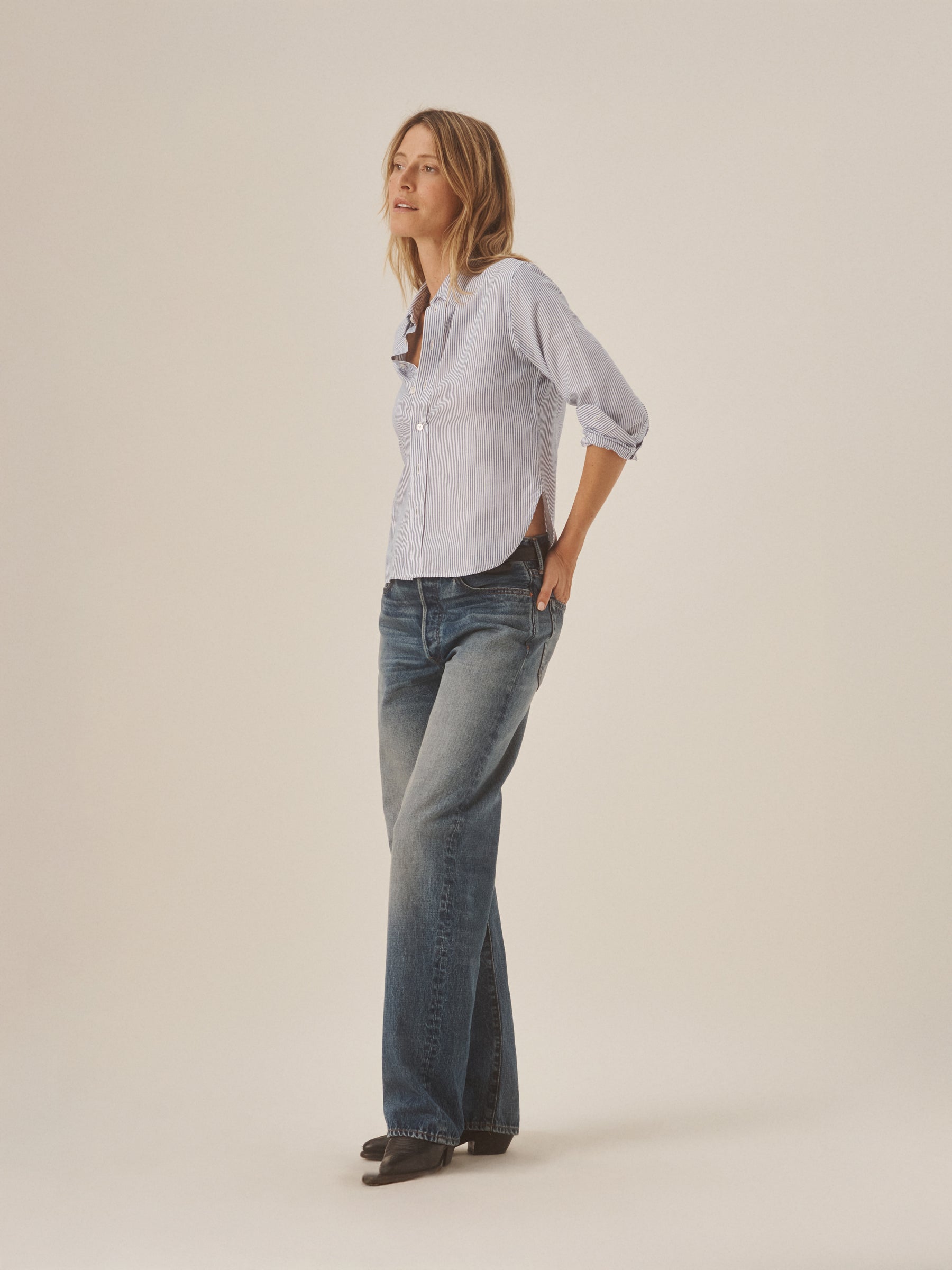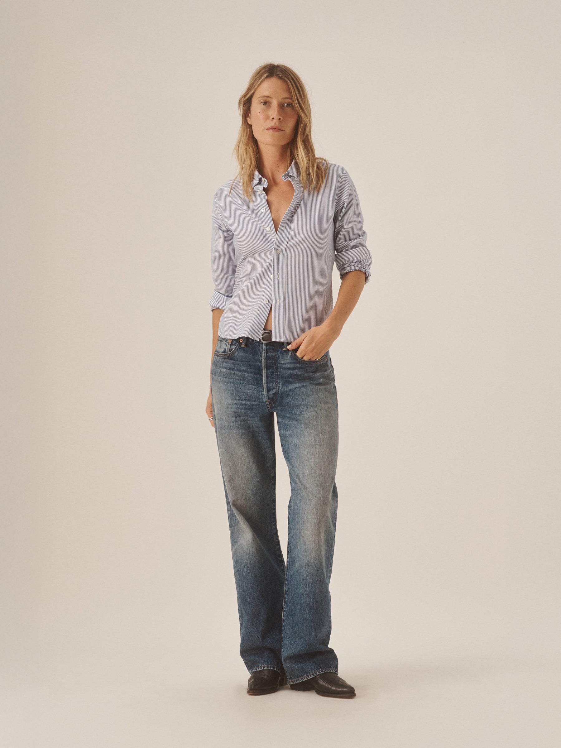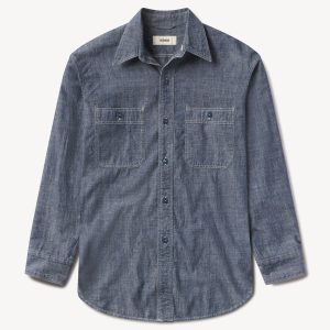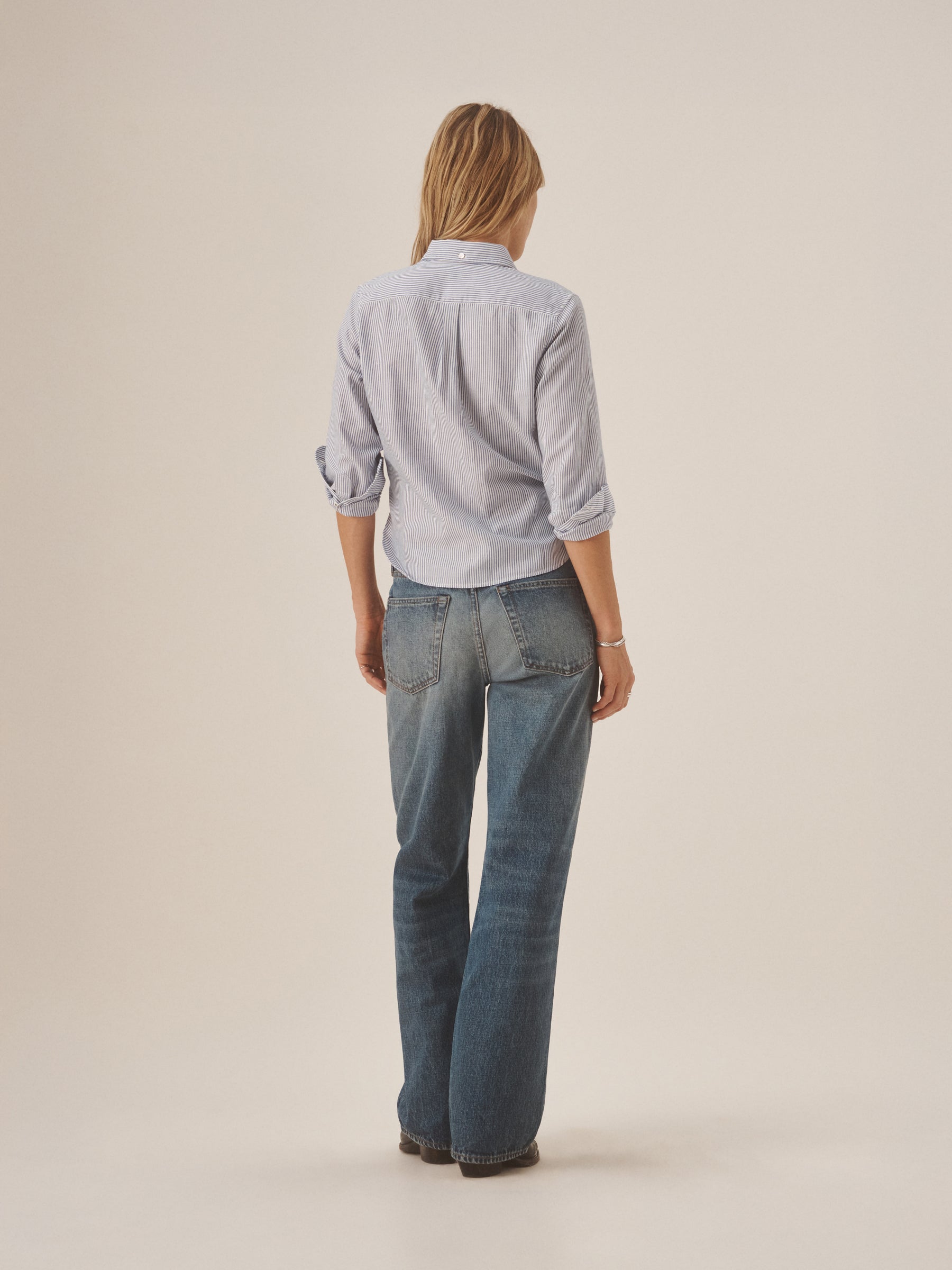 Inspired by 1950s men’s dress shirts, an Oxford cut from a natural, yarn-dyed fiber blend with a soft hand and crisp structure. Our slimmest shirt yet, it’s designed with a button-down collar that holds the perfect roll, stacked mother-of-pearl buttons, and felled seams for durability. Details include knife pleats at the cuff, a box pleat at the back yoke, and a shrunken silhouette made to layer under a blazer or wear solo.