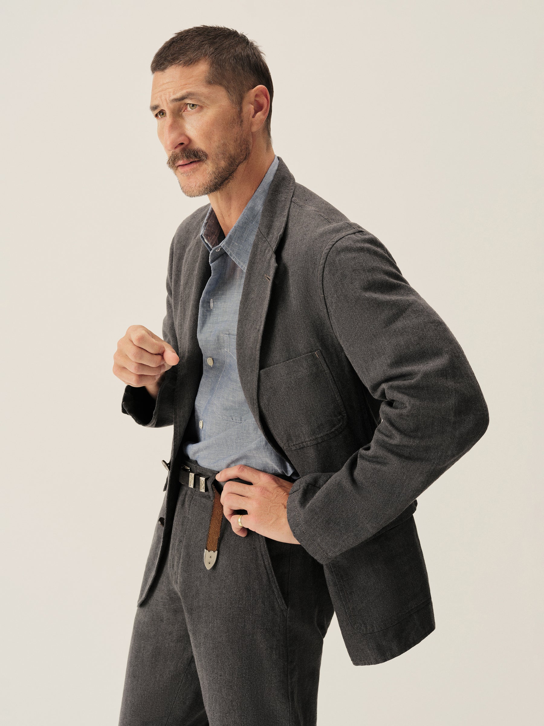 The Carry On Jacket is designed to be casual enough to wear by itself or step up into a full suit with matching trousers. It’s constructed with a classic three-roll, two-button stance with a welt chest pocket and two patch-and-flap pockets at the hip. With no lining or back vent, the jacket is decidedly casual and streamlined. This iteration is made from a light and breathable blend of cotton and linen with a subtly textured herringbone weave.