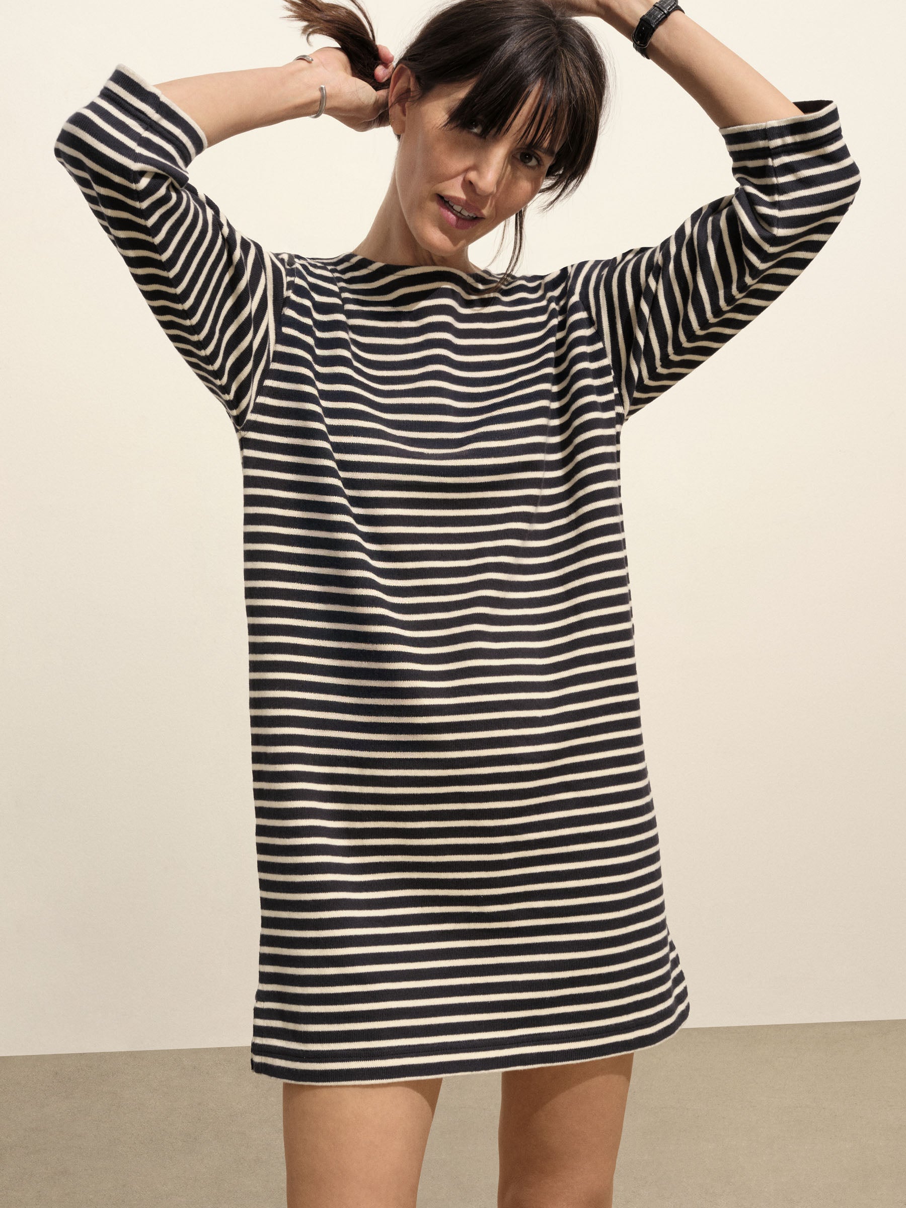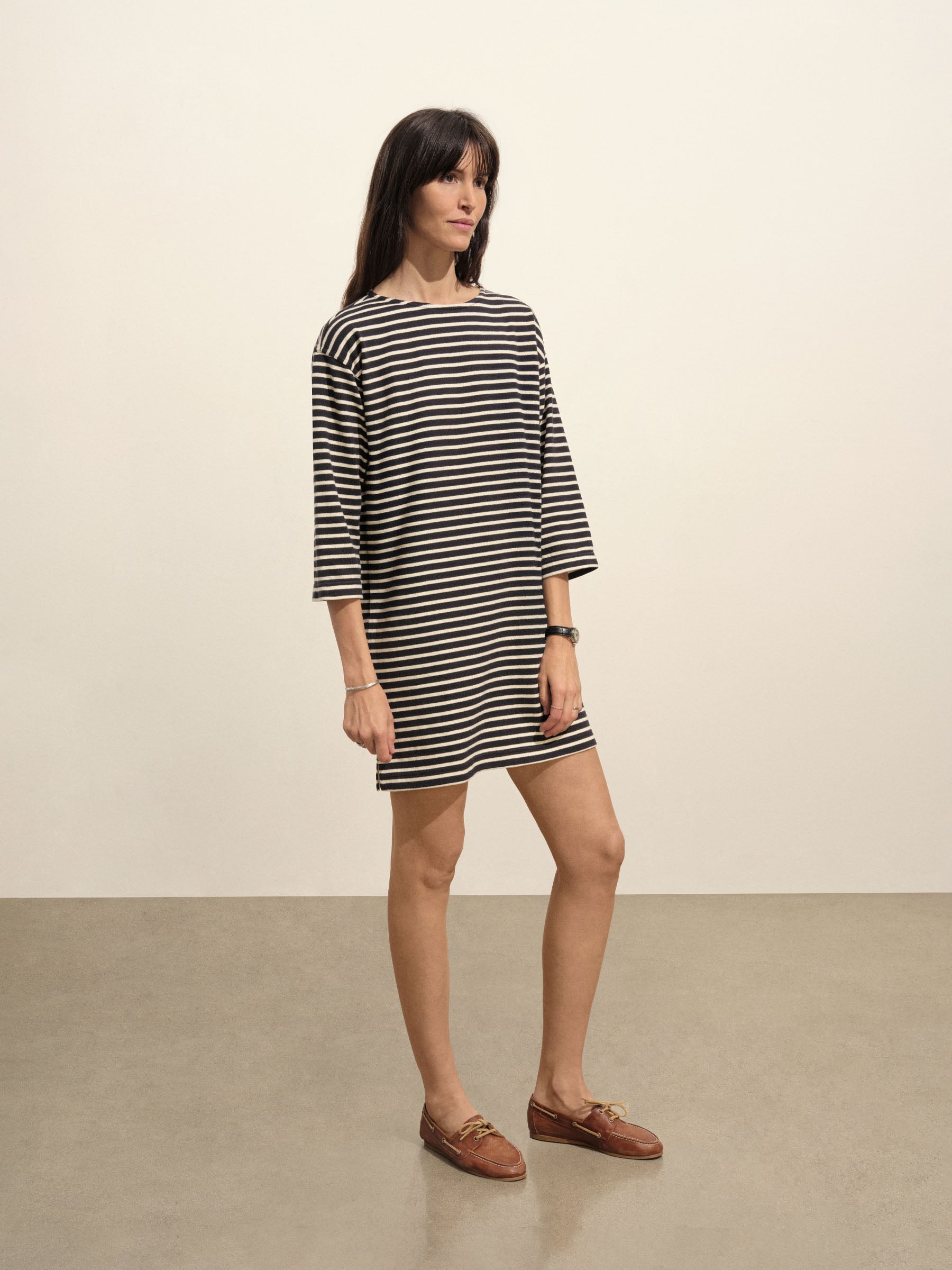 Inspired by classic French Breton stripe shirts, a relaxed boatneck shift dress with long sleeves, made from heavy cotton jersey. Detailed with herringbone tape along the side slits and neckline and finished with a garment wash for a soft, broken-in feel.