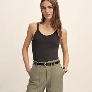 Slim fit, vintage-inspired camisole crafted from a delicate blend of Italian cotton and linen. Constructed from a structured 4×2 rib with a textured hand and a touch of stretch. Garment washed for vintage look and feel.