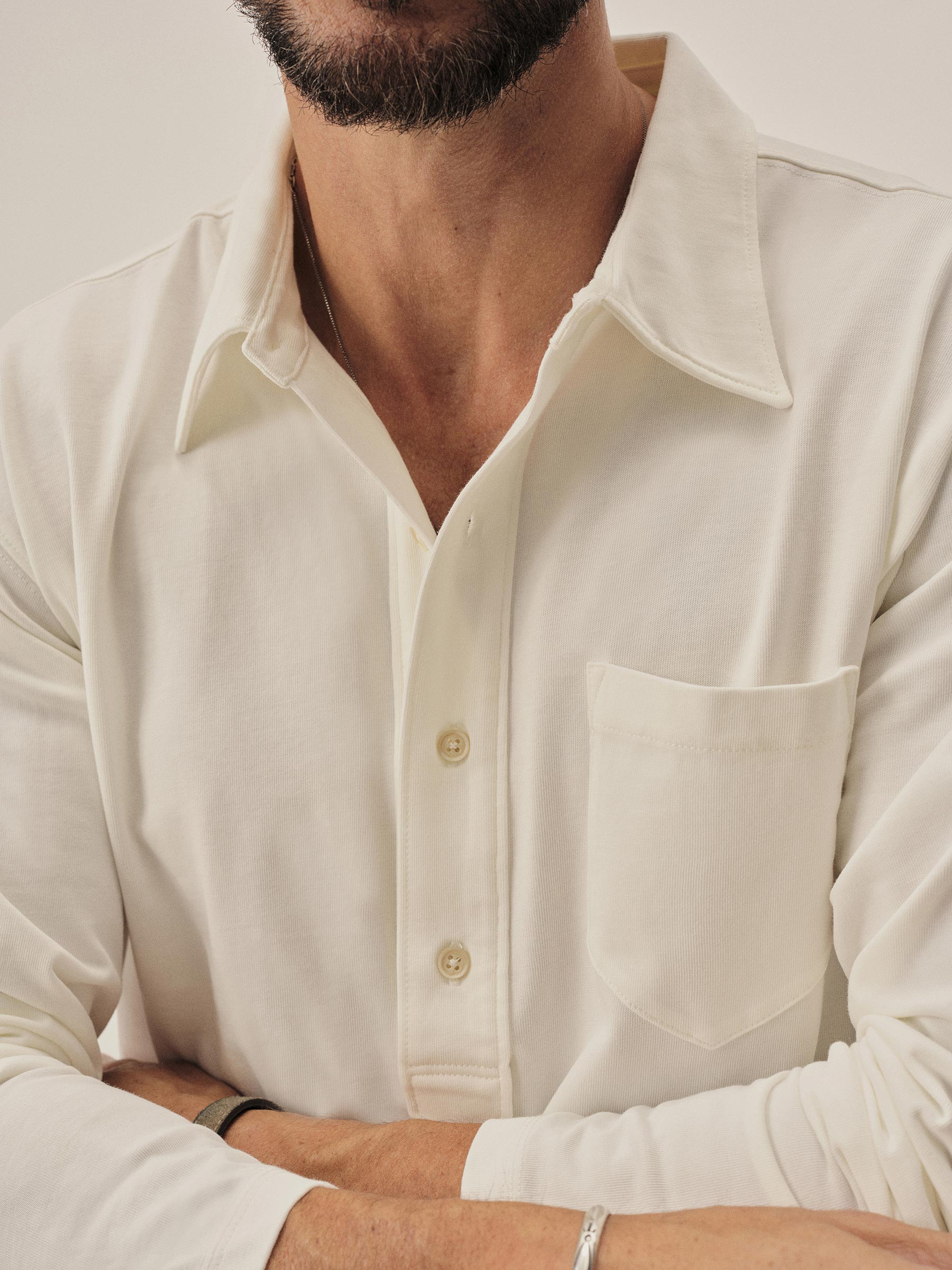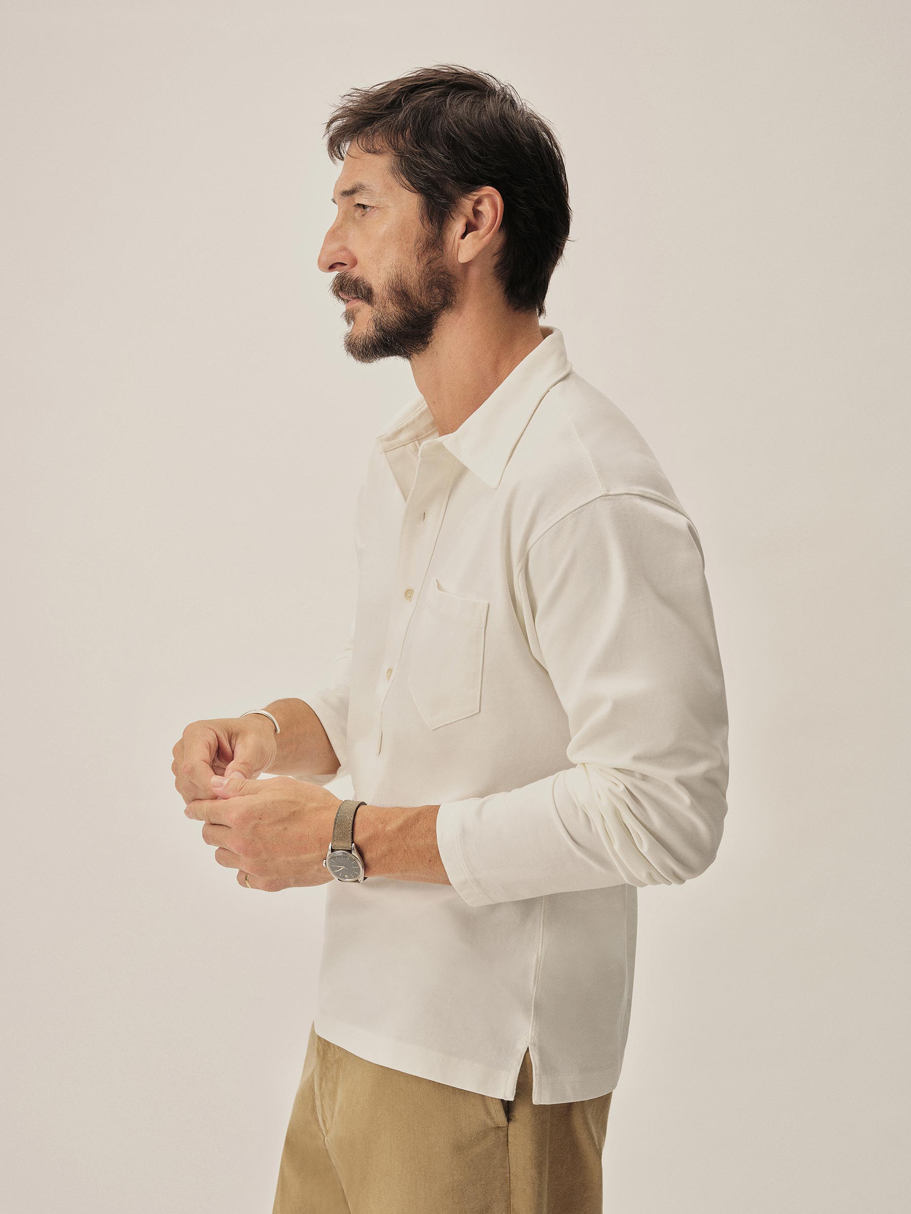 A popover shirt made from a midweight compact cotton jersey with a smooth, uniform texture and cool hand. It features a traditional shirt collar with a four-button half placket and single chest pocket. Ribbed sleeve cuffs.