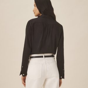 Relaxed-fit sheer shirt made from breathable 80-GSM cotton for a comfortable and airy feel. Featuring shirring at the shoulders and cuffs, a back yoke, and two chest pockets with button closures. Finished with mother of pearl buttons, button-through cuffs, and felled seams. Garment washed for a soft, worn-in feel.
