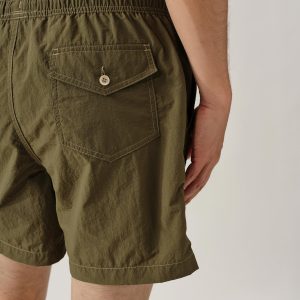 Classic swim shorts are made from lightweight woven nylon using recycled plastic waste found in the ocean. They feature an elastic waistband with an added drawstring for the perfect fit. A small front buttoned pocket and button flapped back pocket help you stow your necessaries in addition to two front slash pockets. 5.5-inch inseam.