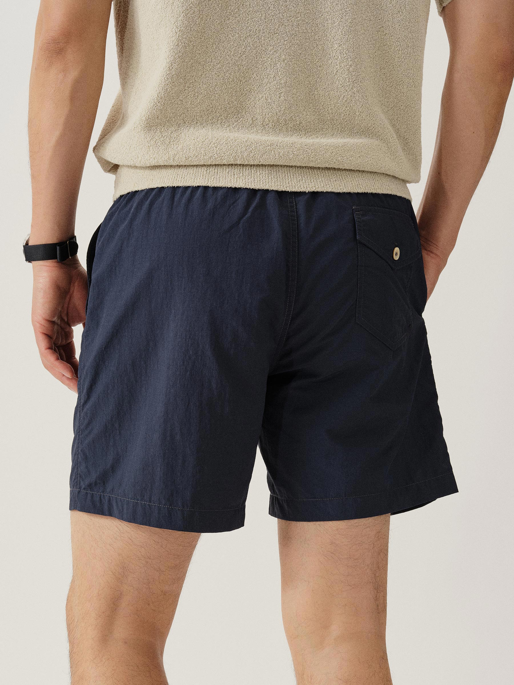 Classic swim shorts are made from lightweight woven nylon using recycled plastic waste found in the ocean. They feature an elastic waistband with an added drawstring for the perfect fit. A small front buttoned pocket and button flapped back pocket help you stow your necessaries in addition to two front slash pockets. 5.5-inch inseam.