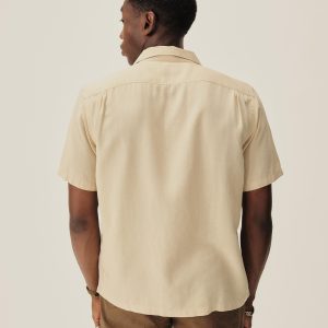 Classic fit short sleeve camp shirt cut from a 5.25 oz. yarn-dyed linen blend with a subtle luster and relaxed drape. Features a six-button placket with mother of pearl buttons, twin patch-and-flap chest pockets, straight hem, and a loop and button closure at the neck. Constructed with clean finished seams. Garment washed with enzymes for a lived-in feel.