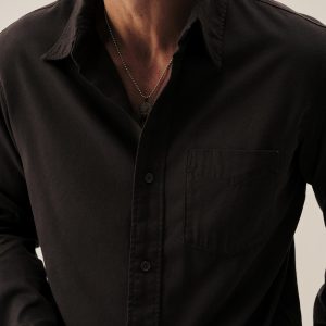 Slim fit long sleeve button up shirt in 5.25 oz. cotton/rayon twill with a subtle luster and an easy drape. Details include mother of pearl buttons, a single spade pocket at the chest, and a box pleat at the back yoke. Constructed with single needle topstitch detailing with double needle stitching at the collar and cuffs. Garment washed with softener for a lived-in feel.