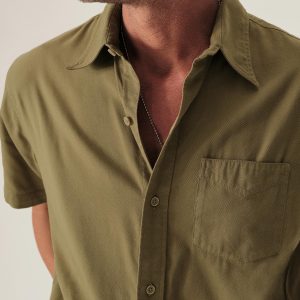 Roomy up top and slim through the body, this lightweight short sleeve button up has a relaxed drape. A casual classic featuring shell buttons and a mid-length hem that looks great tucked or untucked.