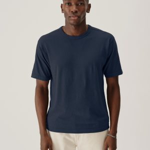 Cut from a substantial and soft, 310 GSM cotton jersey, this 90s-inspired boxy crewneck tee has a straight hemline, longer sleeves that hit lower on the bicep, and a wide-ribbed collar. It features a bound neck with a woven label, and is constructed with a split-needle cover stitch at the shoulders and armholes. Double-washed for a soft, smooth texture and a consistent fit.