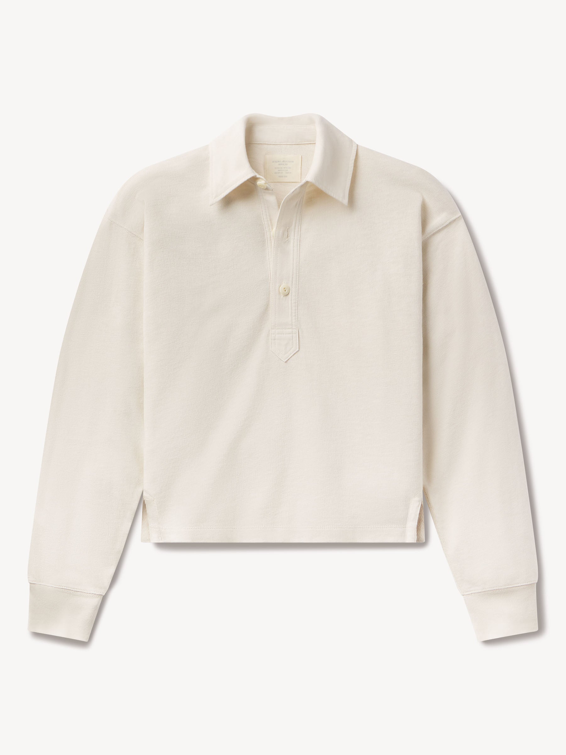 Inspired by the men’s Field-Spec Rugby, the women’s version is cut from 100% cotton in a dense slub jersey with a structured hand. Cut with a cropped, boxy fit and long sleeves, it’s designed with a woven twill collar and placket, tonal poly buttons at the center front, and herringbone-trimmed side slits.