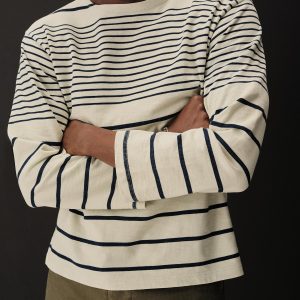 Nautical-inspired boxy fit short sleeve wide neck tee with a straight hem, longer sleeve length, drop shoulder, high neck, and wide ribbed collar. The soft cotton jersey, yarn-dyed in indigo and black sulfur stripe pattern, is about twice as heavy as our Pima tees, with tiny vertical ribs that gently glide across the skin. This is a solid, substantial stand-alone tee for cold weather that will pick up a ton of character over time.