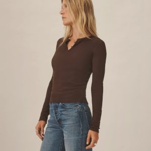 “Slim fit long sleeve henley cut from extra fine 170 GSM cotton with recycled content that holds its shape. Details include a a three-button loop placket with corozo fish eye buttons, and straight, clean finished hem and cuffs. Garment washed for a lived-in feel.