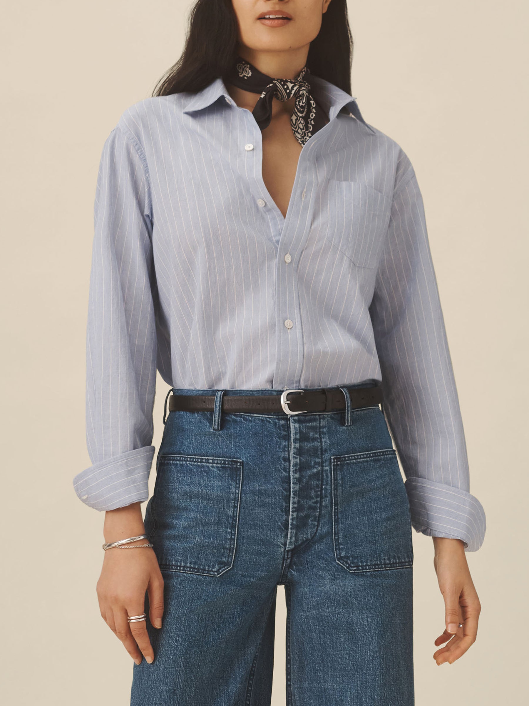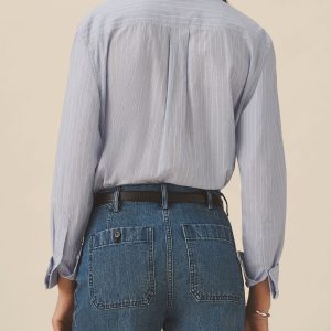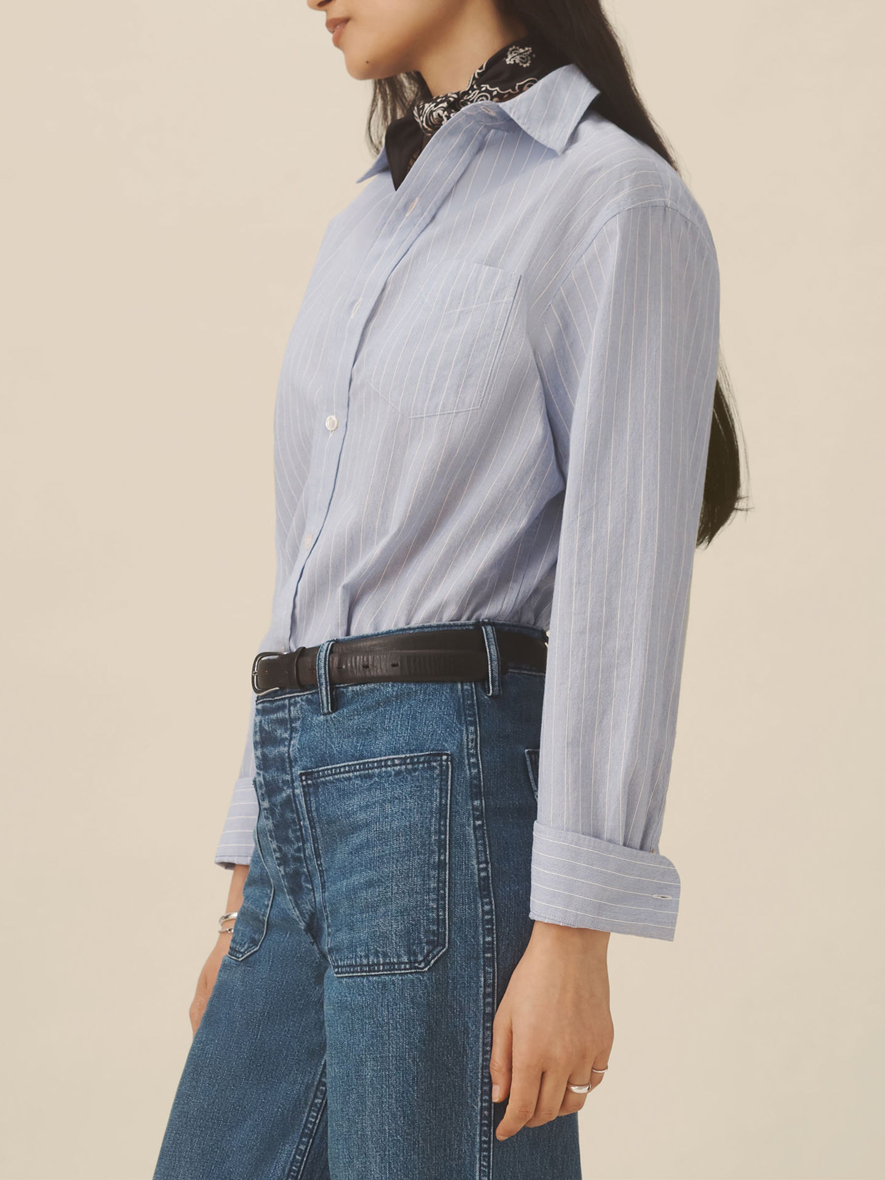 Relaxed button-down shirt in 3.7 oz. cotton plainweave. 29.5” length hits just below the hip. Details include a back yoke with box pleat, a single spade pocket, and pleated cuffs. Inspired by mid-century men’s shirting, this piece can be worn on its own, layered over a tee, or paired with our Rider Pant. Garment washed with softener for a lived-in feel.