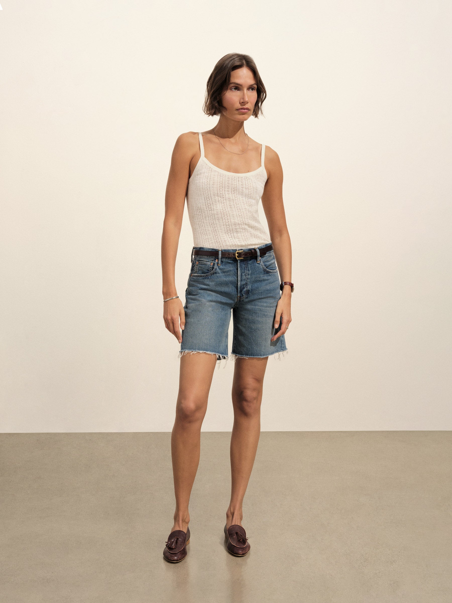 Summer-ready mid-rise cutoffs with an 8” inseam, crafted from 12.9 oz. indigo-dyed Japanese denim. Featuring metal rivet reinforcements at pockets and finished with a button fly. Garment-washed for a vintage look and feel.