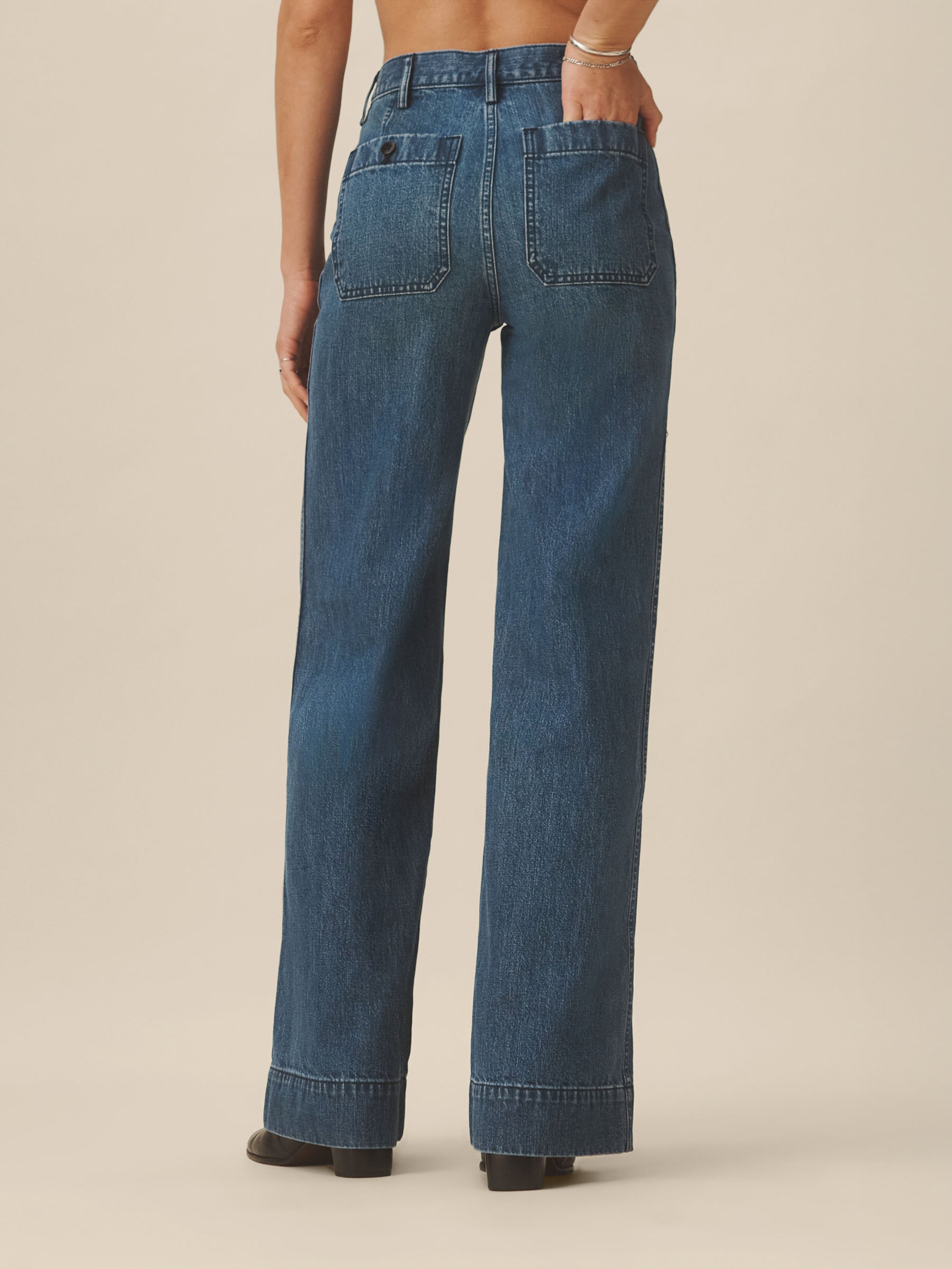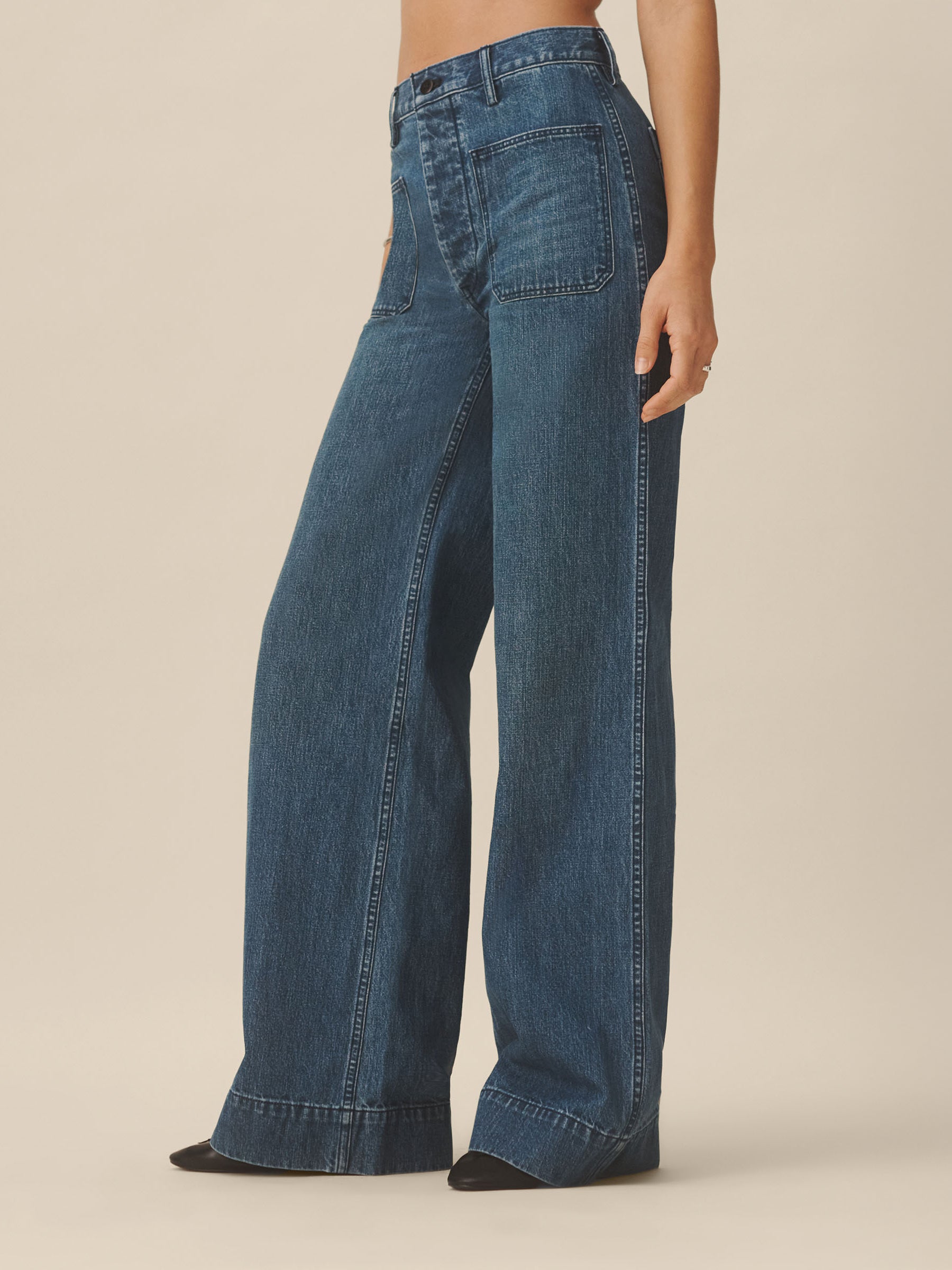 Inspired by 1940s US naval utility uniforms, a pant cut from 100% cotton Japanese indigo denim and finished with a traditional button fly. Designed with a high rise, front patch pockets, felled outseams, and a wide hem.