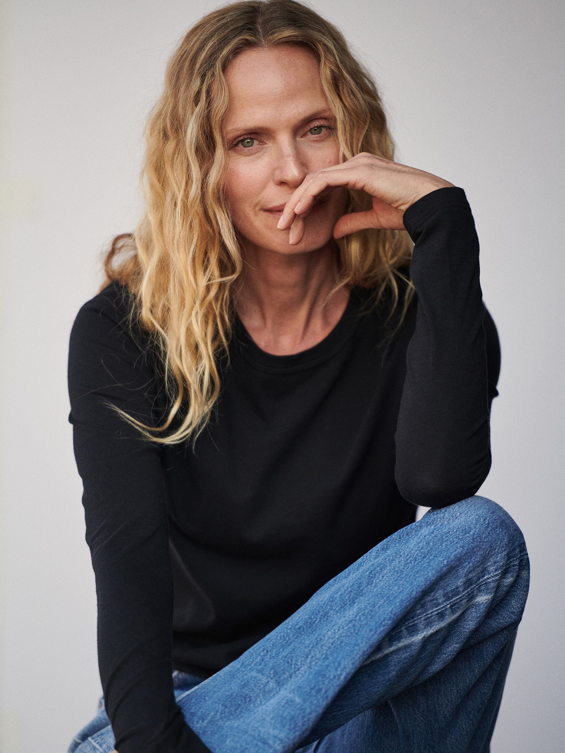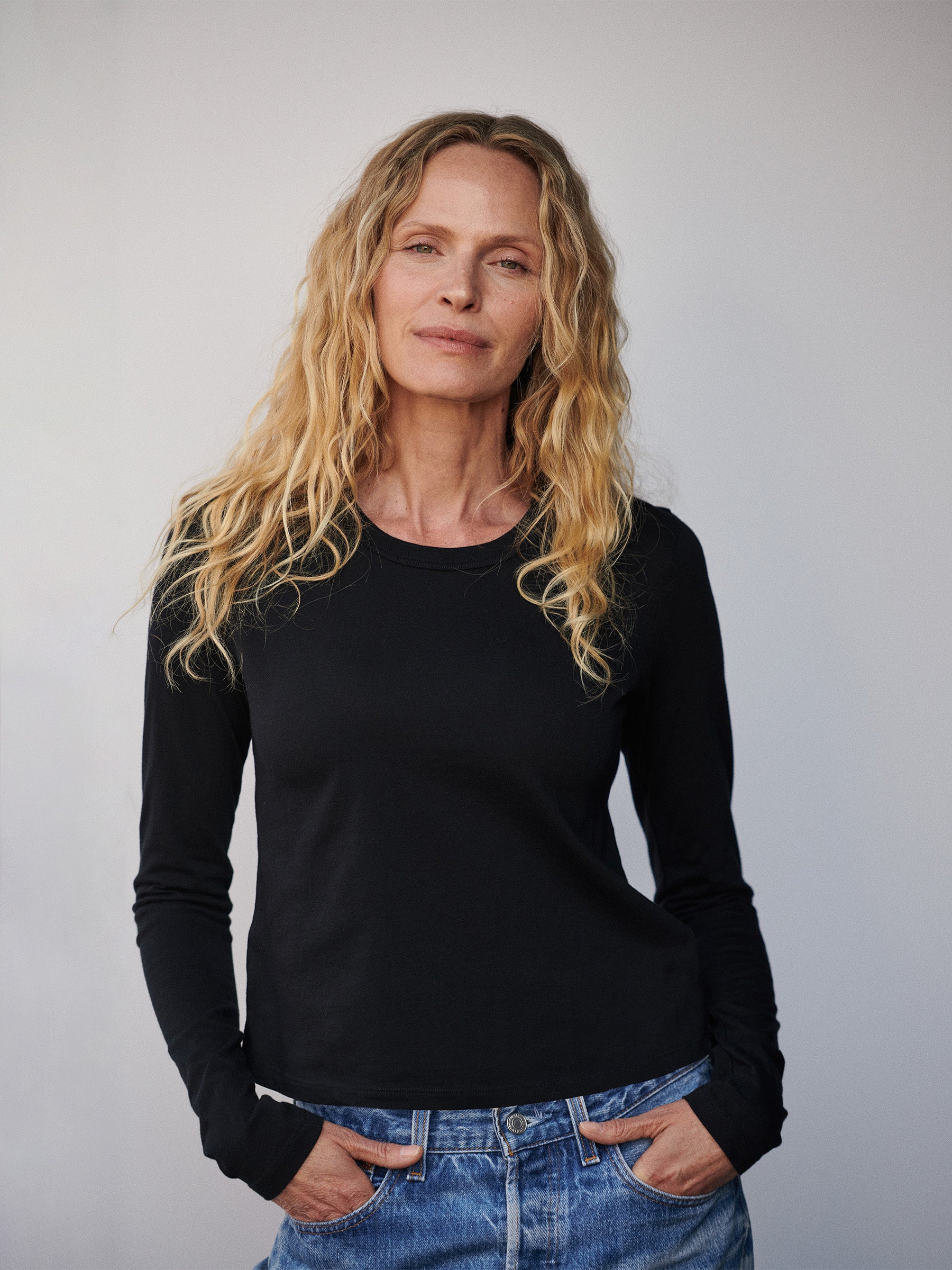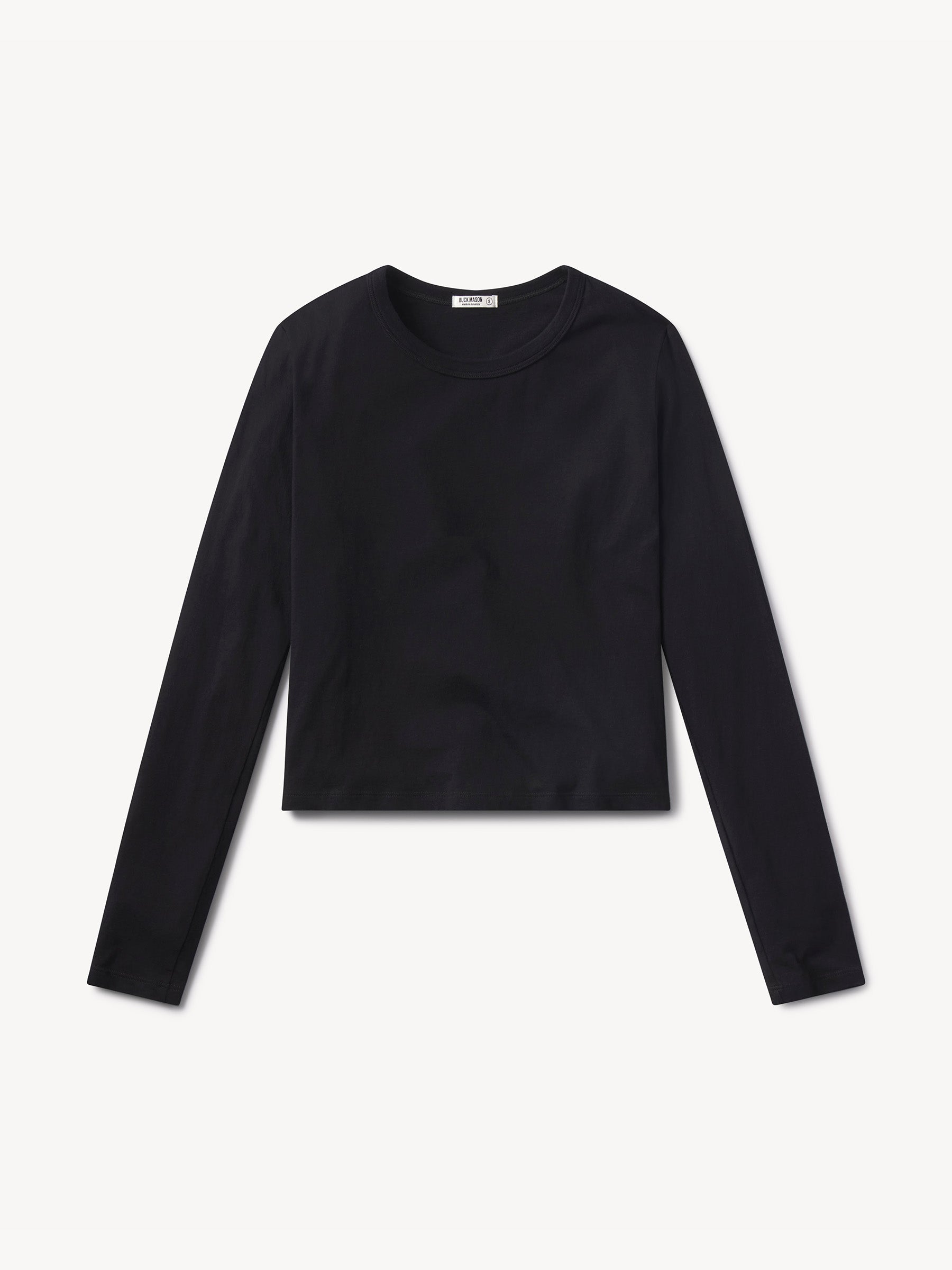 Boxy long-sleeve crewneck in a cropped 20” length that hits at the waist. Cut from 120 GSM jersey knit from long-staple Supima cotton. Features a ribbed neck and cover stitching at the hem. Garment washed for a lived-in feel. Grown and sewn in the U.S.A.