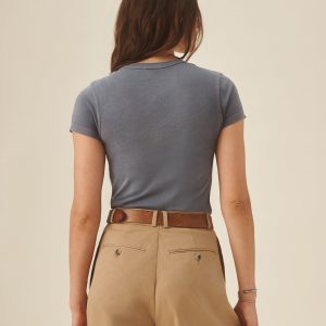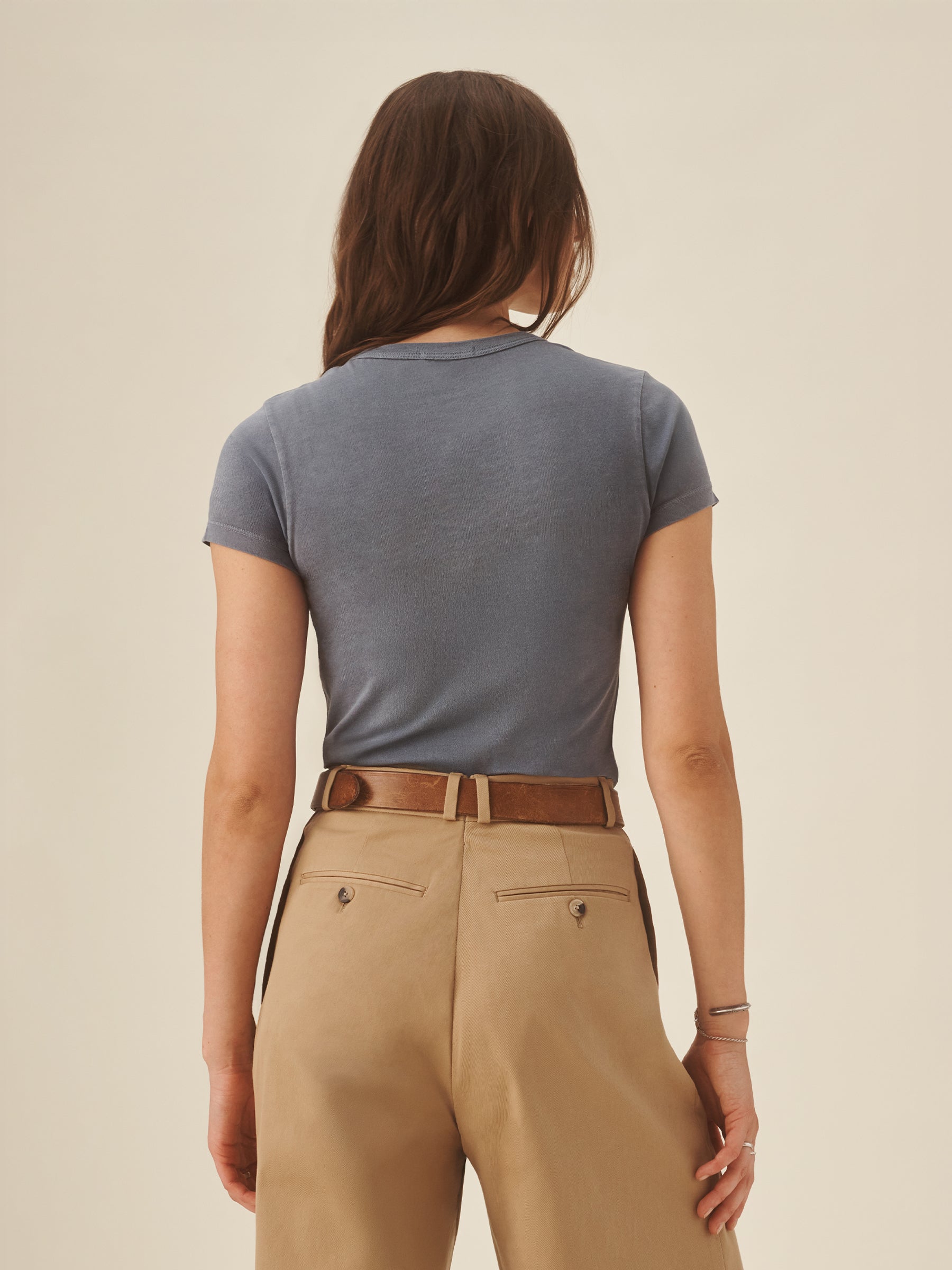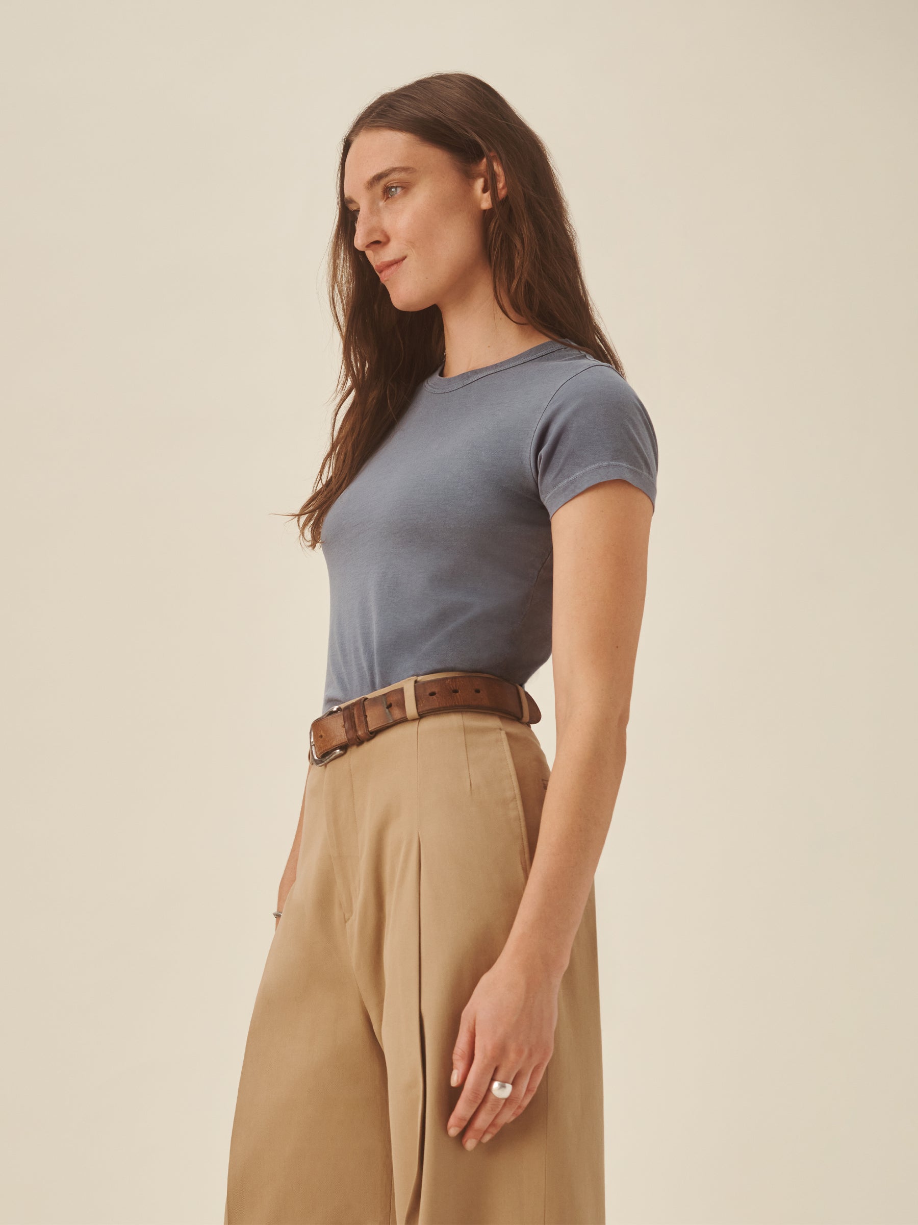 Slim fit short sleeve crewneck tee with a straight hem in 120 GSM jersey, knit from long-staple Supima cotton. Constructed with a durable rib stitch collar and double-needle cover stitch hem. Garment washed with softener for a lived-in feel.