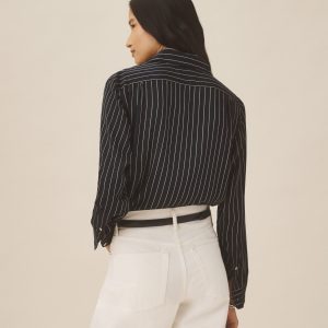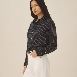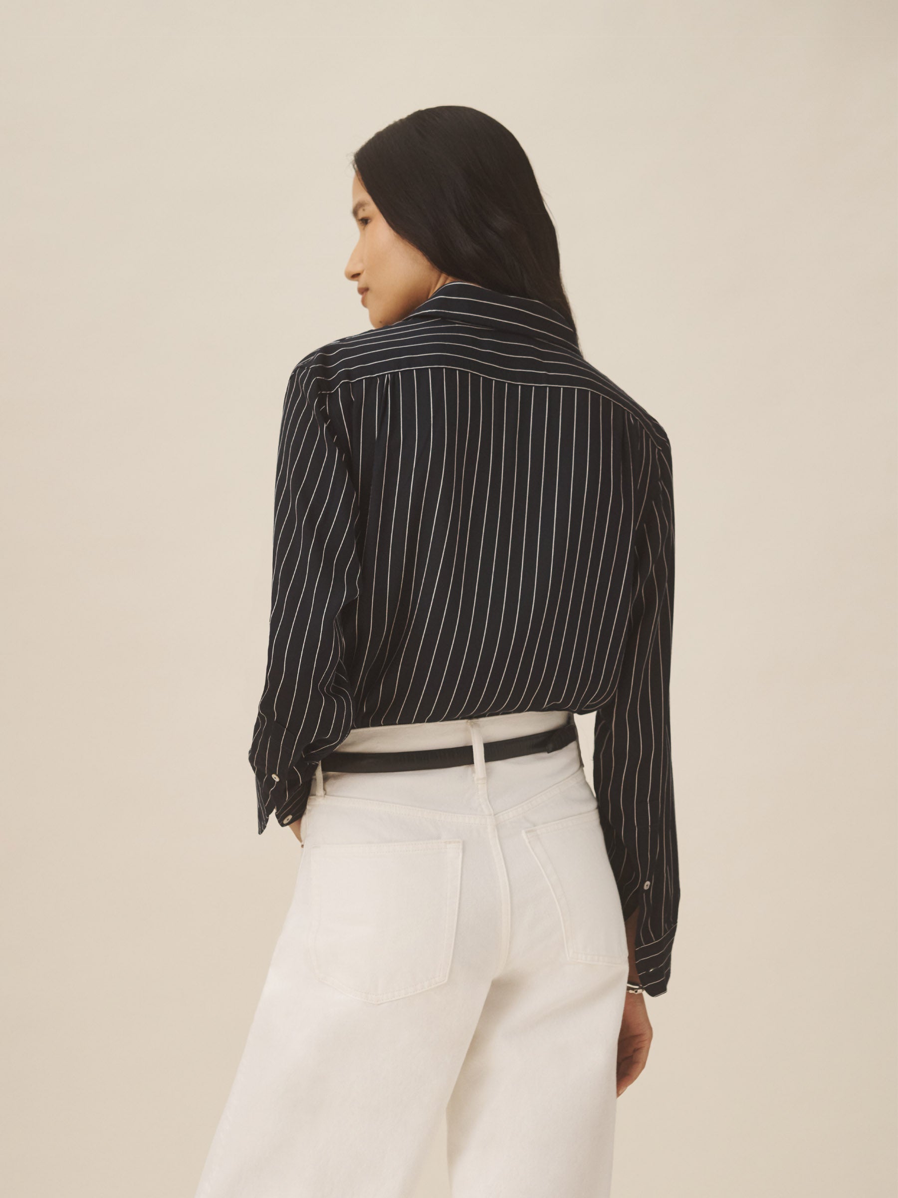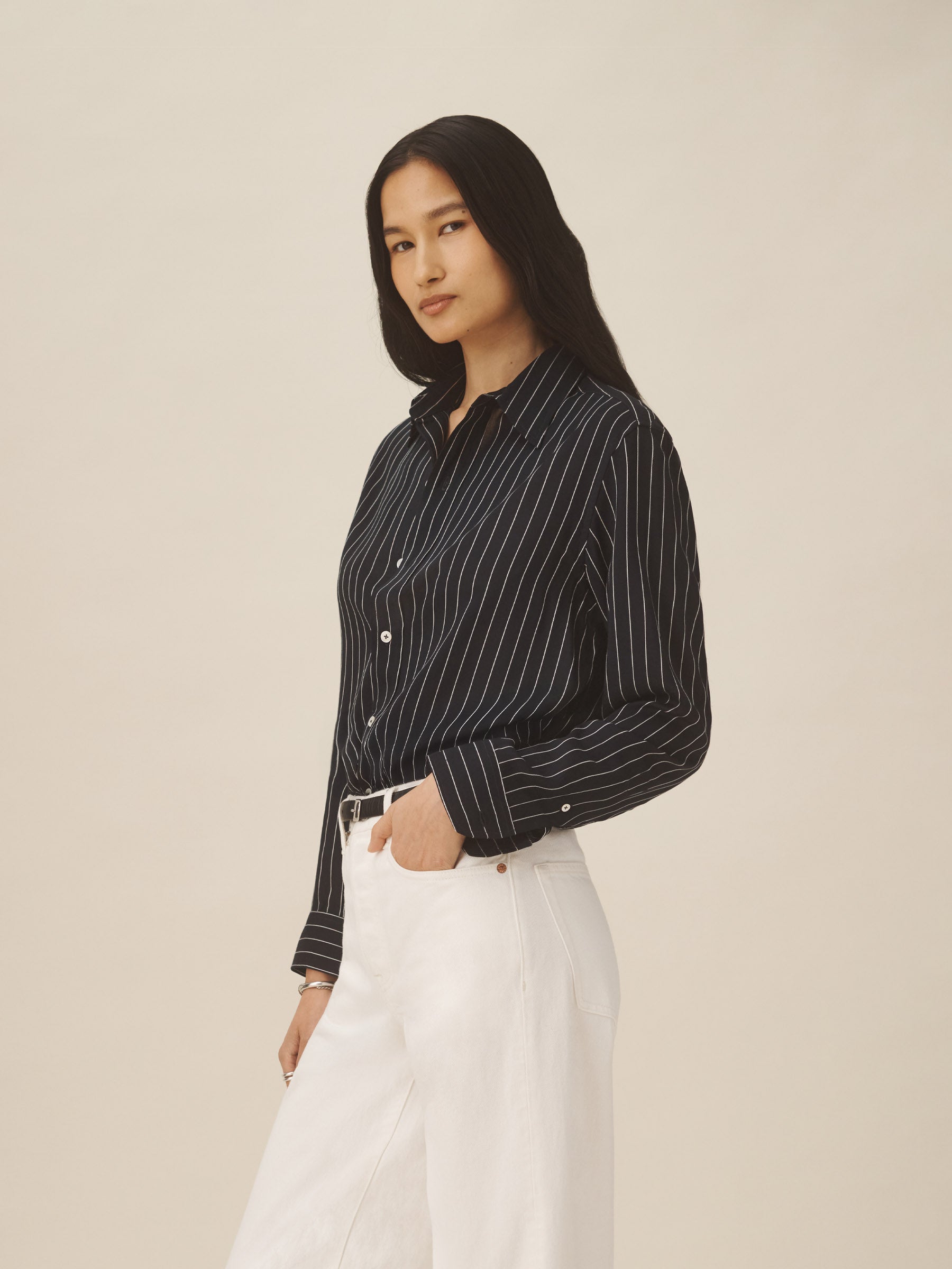 A modern take on men’s sportswear shirts from the 1940s, a relaxed button-down shirt in a silky rayon jacquard weave. Featuring a carved collar, side-seam gussets, button-through plackets along shirt front and sleeves, and pintuck detailing on back yoke and sleeve cuffs. Finished with side-seam gussets and mother of pearl buttons.