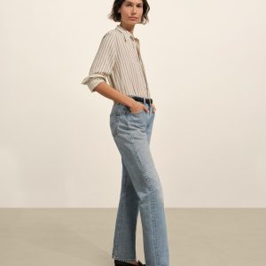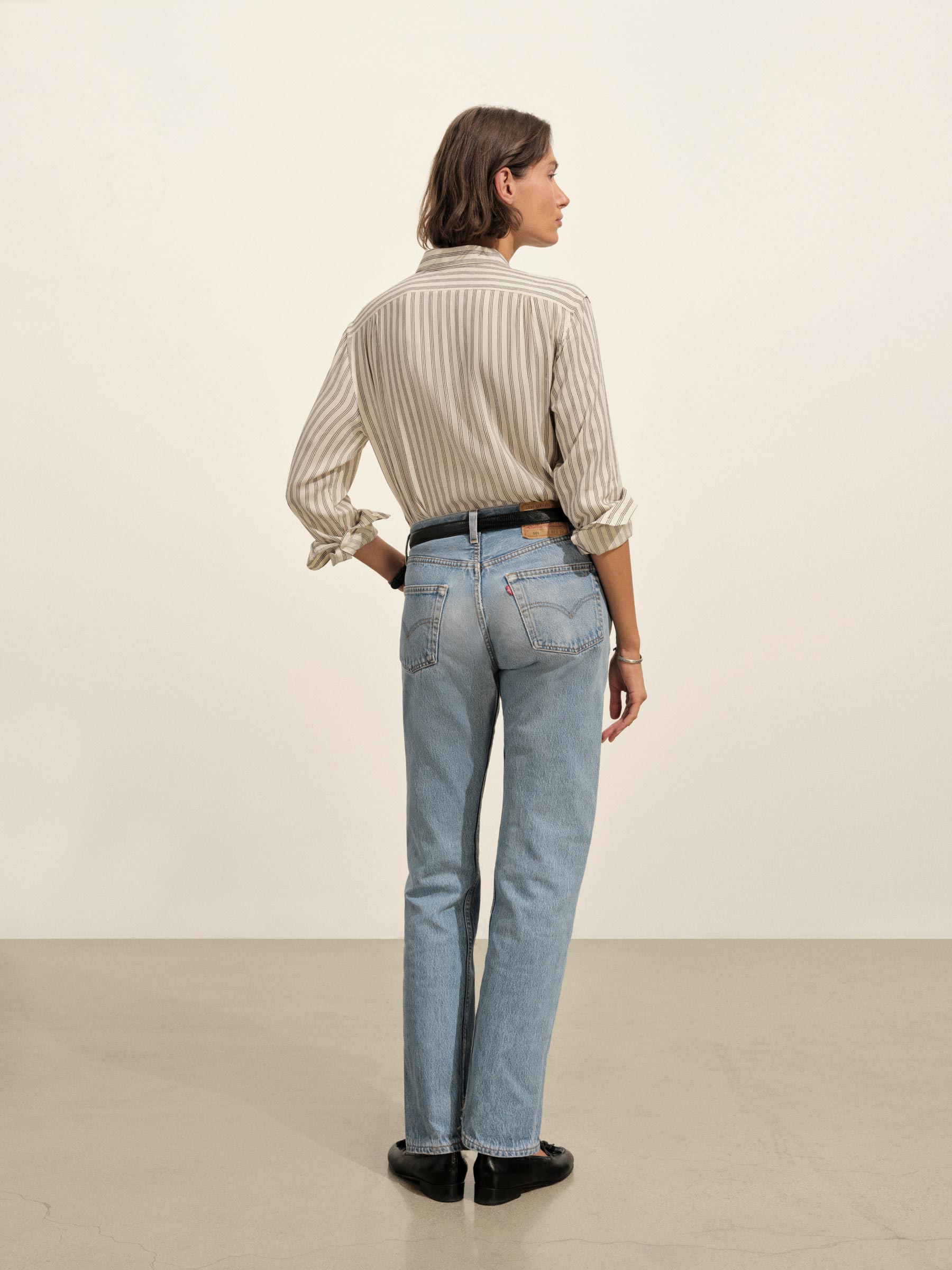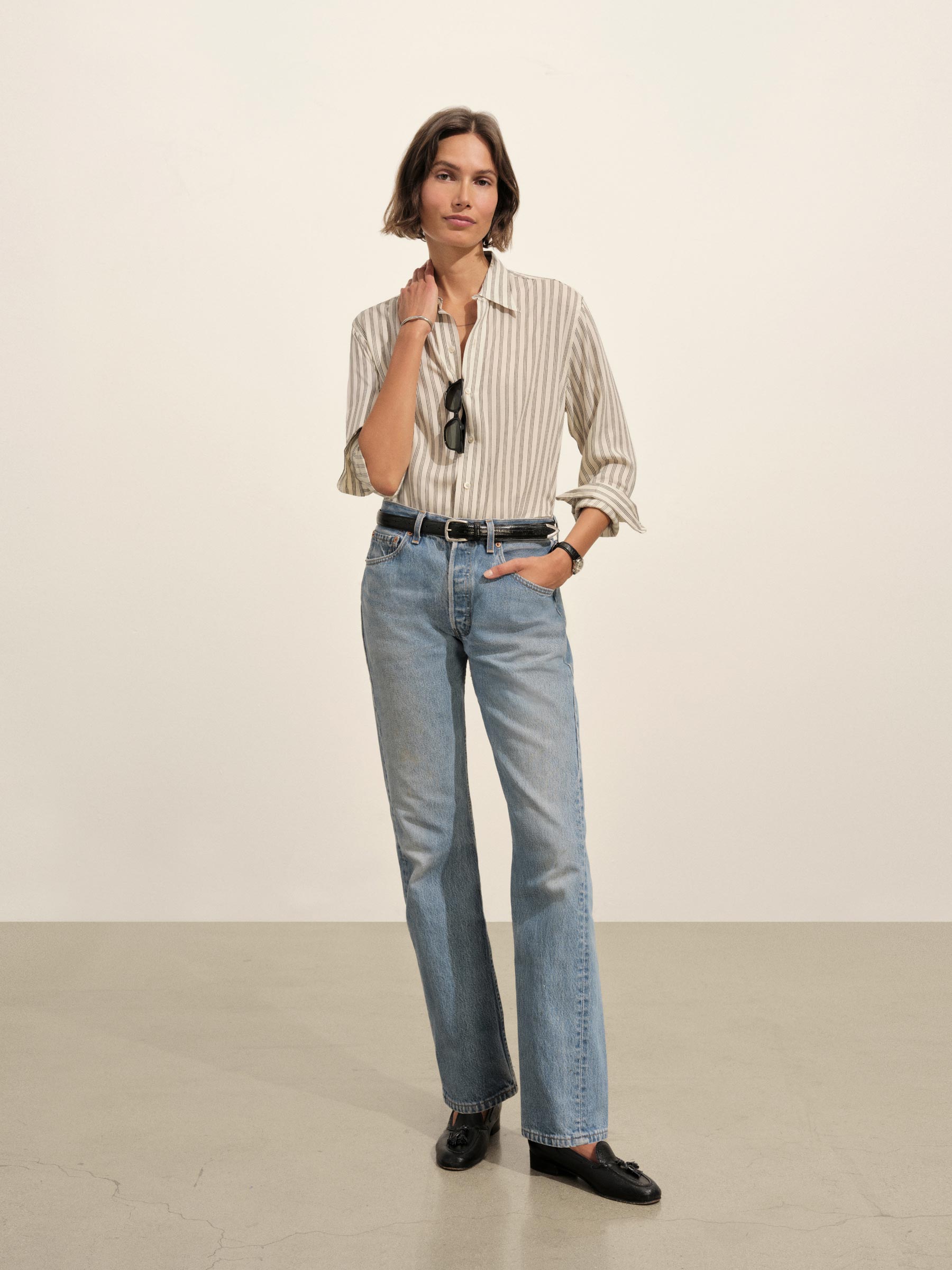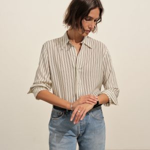 A modern take on men’s sportswear shirts from the 1940s, a relaxed button-down shirt in a silky rayon jacquard weave. Featuring a carved collar, side-seam gussets, button-through plackets along shirt front and sleeves, and pintuck detailing on back yoke and sleeve cuffs. Finished with side-seam gussets and mother of pearl buttons.
