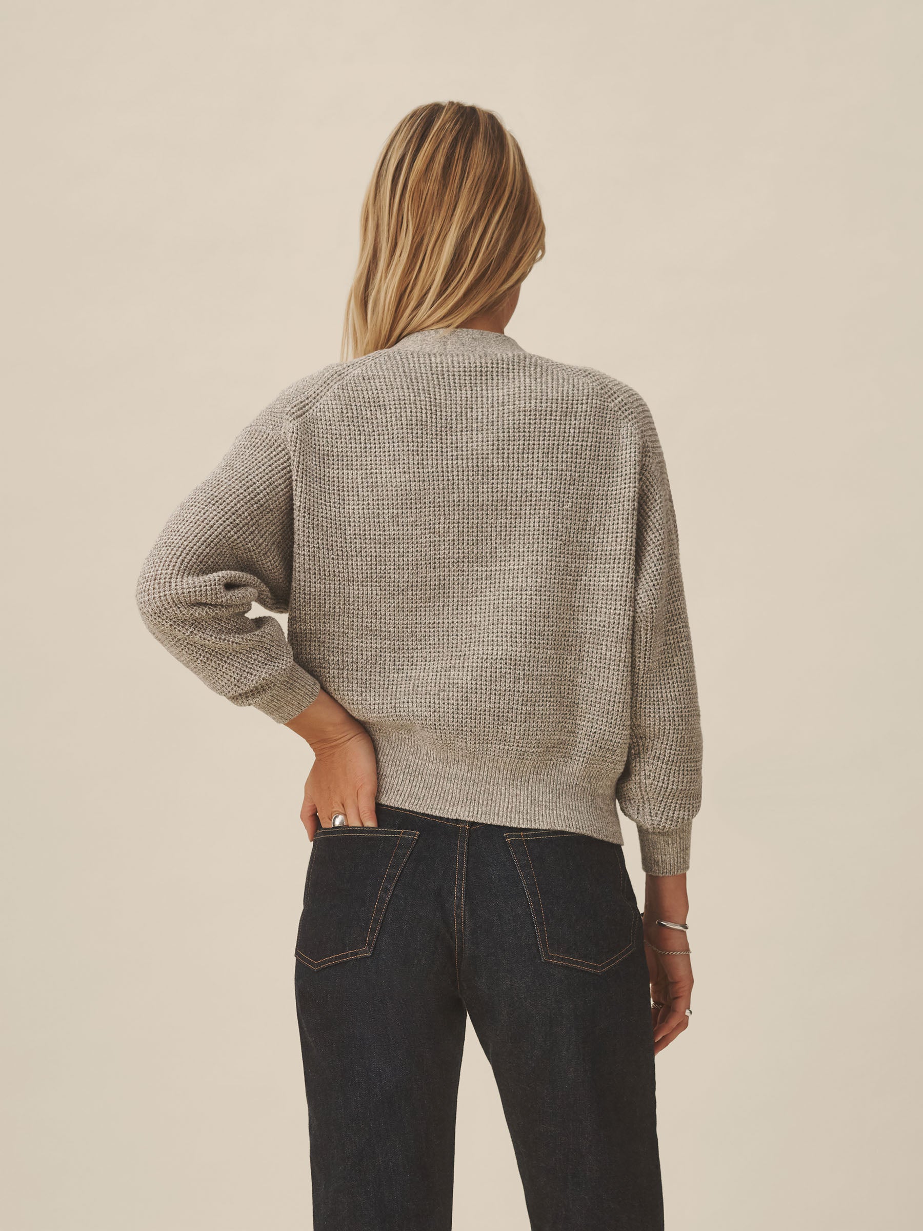 A relaxed cardigan made from marled cotton yarn and knit in a classic waffle stitch. Designed to layer over tees, it’s built with a functional front placket with urea buttons, patch pockets, and a clean V-neckline.
