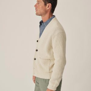 Classic fit fisherman’s cardigan sweater in a homespun textured cotton rib with two patch front pockets and a 5-button front closure. Constructed with hand-linked seams, double layer ribbing at the front placket, and racking stitch detailing at the cuffs.