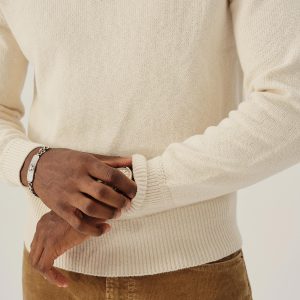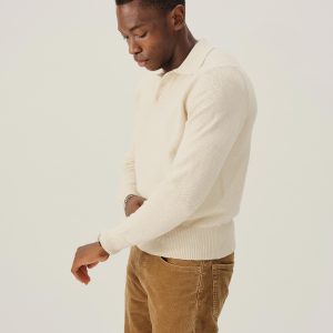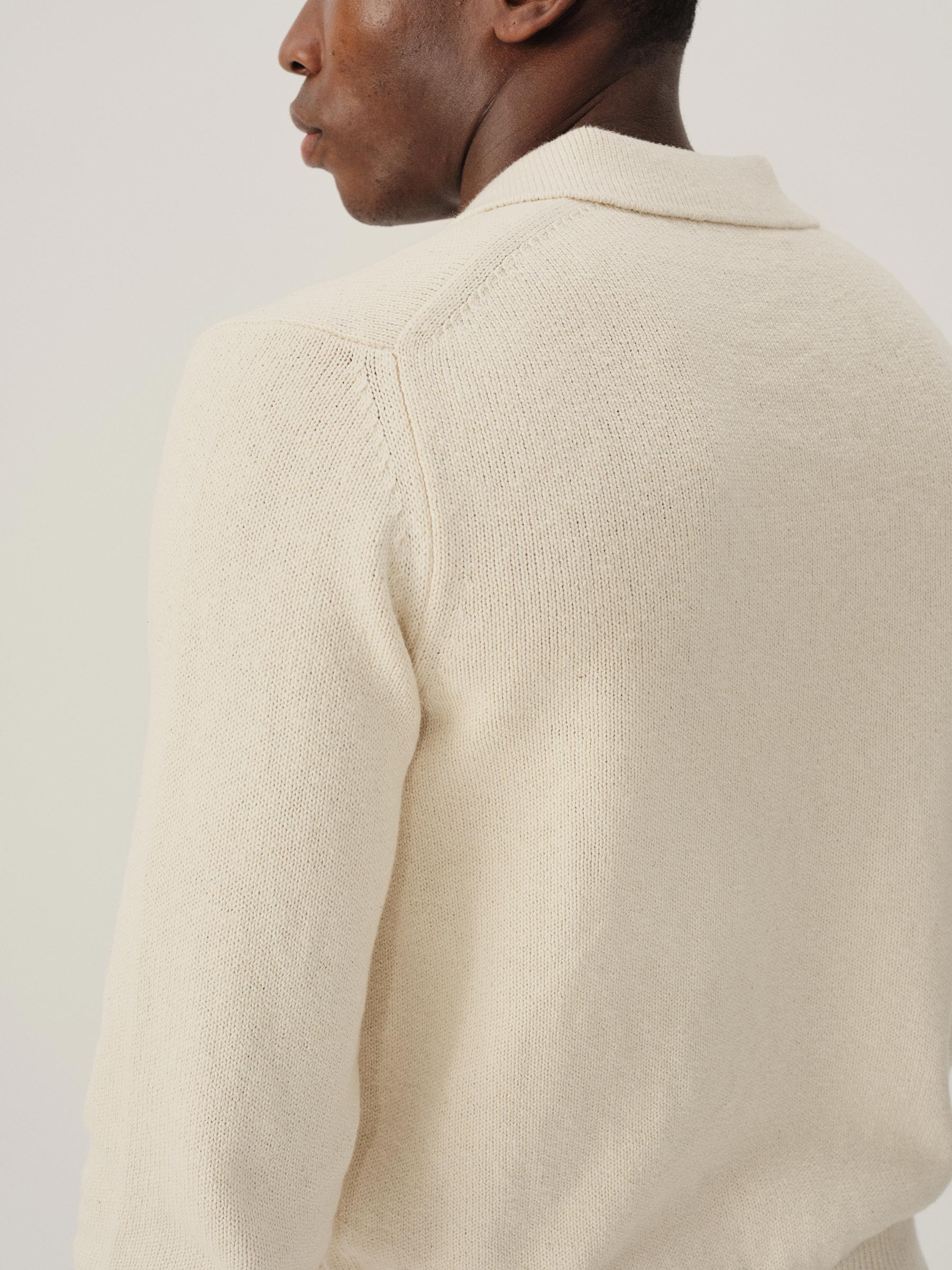 Classic fit polo sweater in a 7 gauge half cardigan rib knit from our homespun yarn-dyed cotton. Features a 3-button rib center front placket with nacre buttons and a rib collar designed to lay flat. Constructed with hand-linked seams and racking stitch detailing at the cuffs.