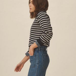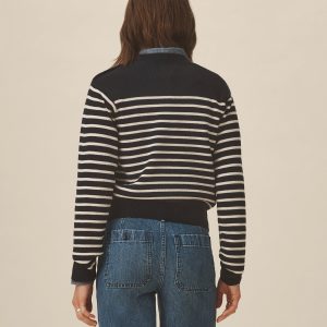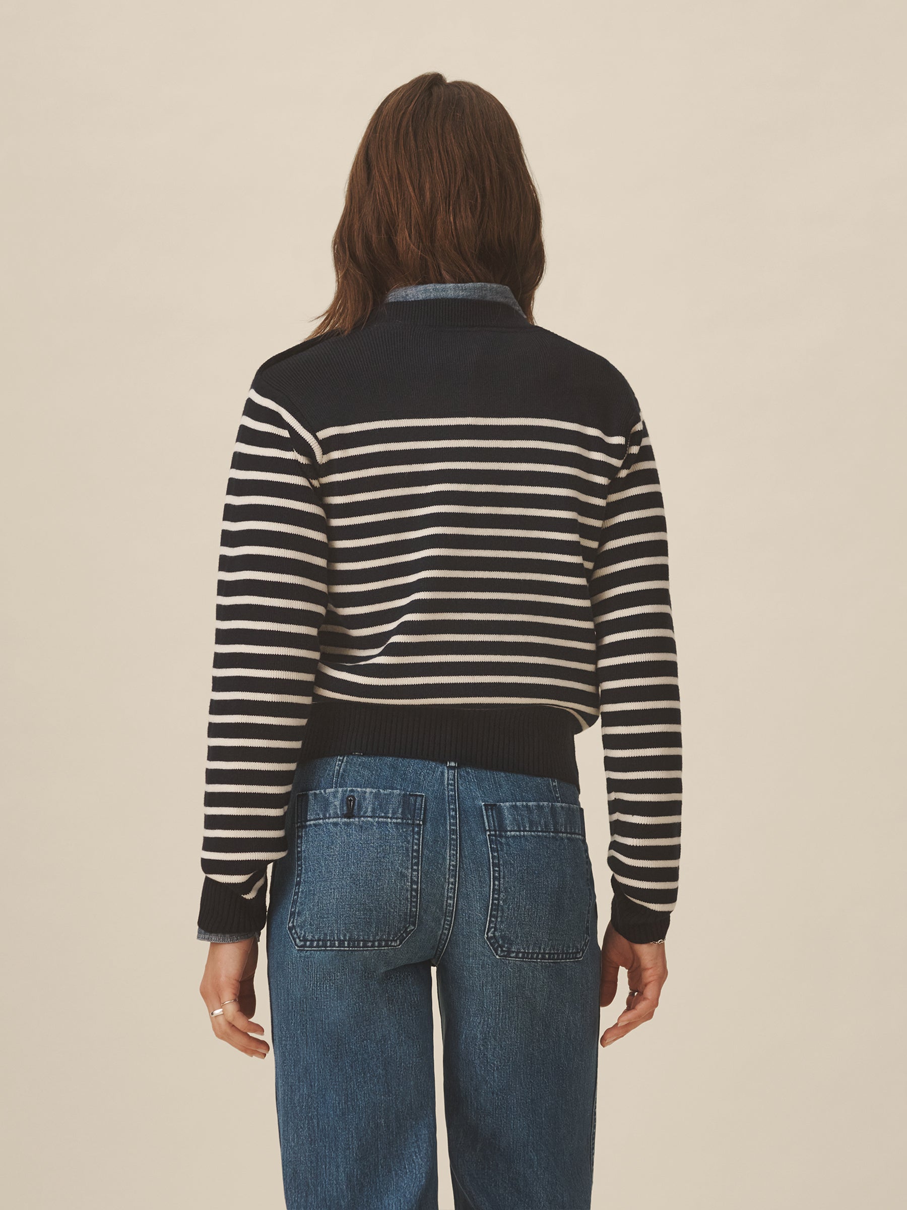 Inspired by classic French mariner sweaters, a knit in Italy Breton-striped crew from a yarn-dyed blend of extrafine merino wool and cotton. Knit with a subtly textured 12-gauge full-needle rib stitch. Designed with a slightly shrunken fit and finished with functional buttons at the shoulder.