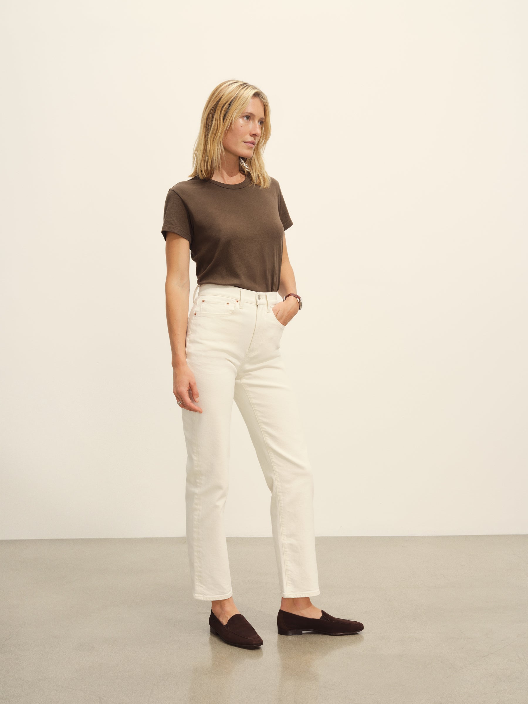 Classic fit short sleeve crewneck tee with a straight hem, cut from 125 GSM cotton with light slub texture. Constructed with self neck binding and ladder stitch detailing at the hems. Garment dyed and washed with softener for a lived in feel.