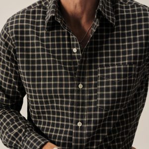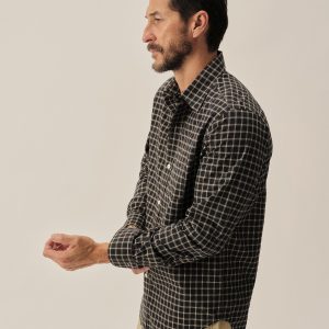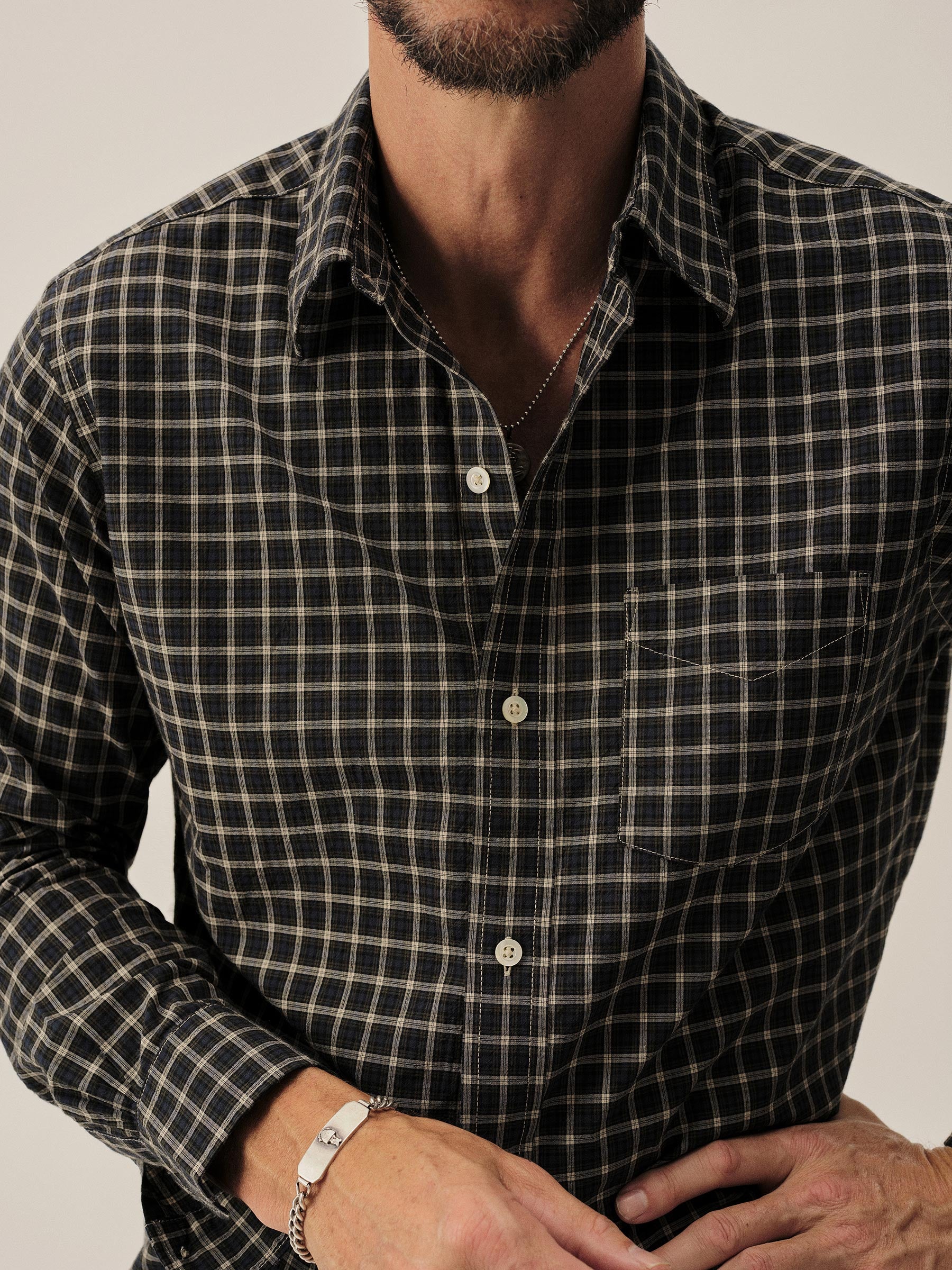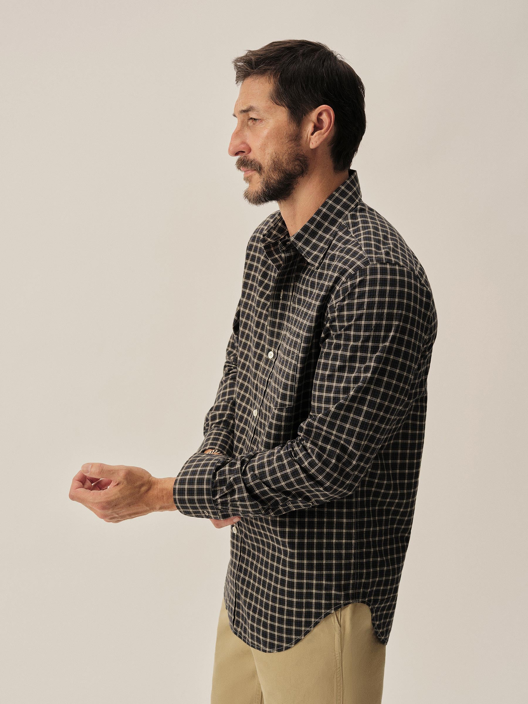 Slim fit long sleeve button-up cut from 4 oz. washed cotton. Details include a button placket, a single spade pocket at the chest, and a box pleat at the back yoke. Constructed with single needle topstitch detailing with double needle stitching at the collar and cuffs.